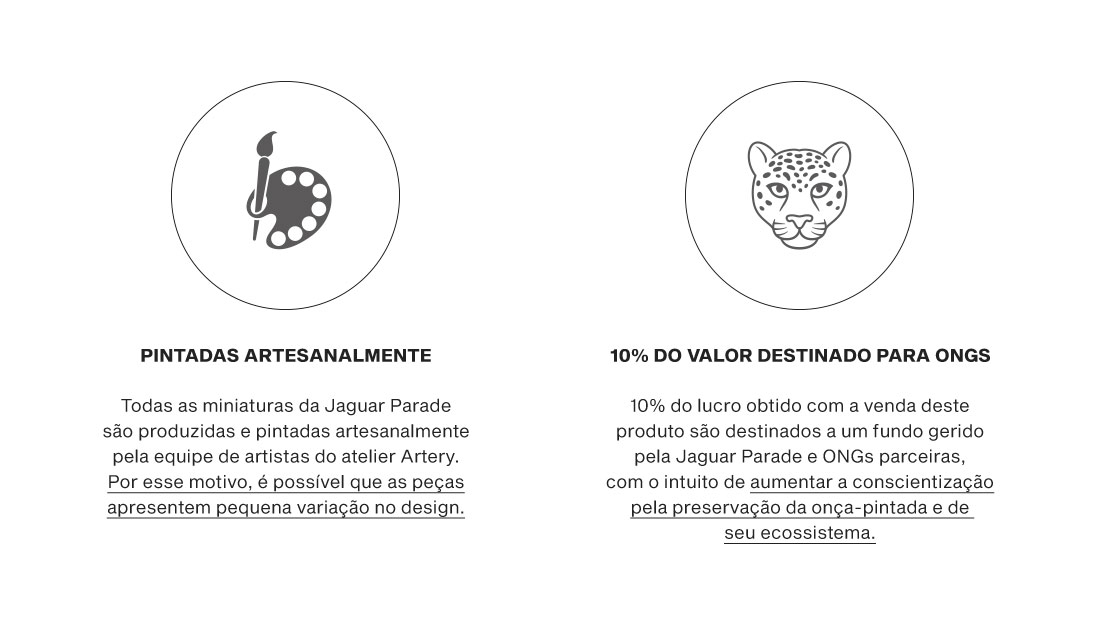 10% do lucro obtido com a venda deste produto serão destinados a um fundo gerido pela Jaguar Parade e serão usados para aumentar a conscientização pela preservação da onça-pintada e de seu ecossistema por meio da arte e também para apoiar ações práticas de preservação em parceria com ONGs engajadas nesta causa.
